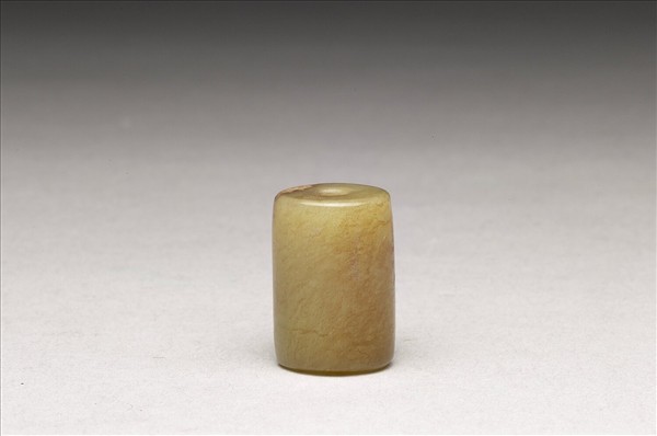 玉質,有璺與赭色牛毛紋沁。圓柱形,上下對穿圓孔,全器光素無紋飾。自新石器時代至明清,歷代都有玉管的製作,既可串連多件玉管組成項鍊,亦可與其它玉飾串連形成組佩。此件略歪斜不正,兩端轉折處微縮,玉質似為和闐玉,整體觀之,較似組佩上的玉管。