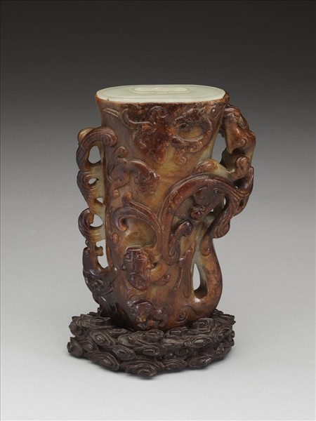 上大下小扁三角錐形,器內置扁圓筒形銅膽,銅膽外包以猩紅色絹,膽蓋乃白玉製作。環器鏤空、浮雕「龍生九子」吉祥題材,九螭形態變化生動,雕琢工法精練靈活。器表正、背面呈褐紅色,乃為強化作色結果,器兩側面尚保留原青白玉的色澤,全器細潤光澤。作薰具使用。有木座。仿漢風之物。