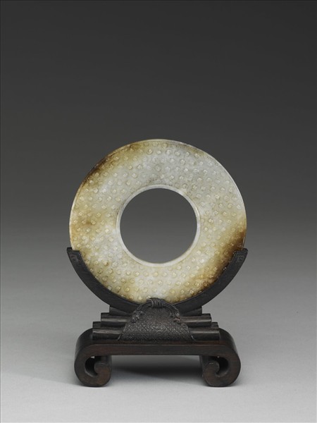 器形規整,厚薄均勻。兩面均浮雕穀紋,排列整齊,是當時最為普遍的類型。附清代之木座。