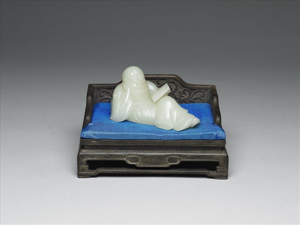 玉質,色純淨白潤。全器琢一老者,作半臥狀,右手托腮,左手持一書卷,雙腳相互交叉,背靠一書函,狀頗自然。附紫檀木座,座如榻几狀,上附青錦墊。
