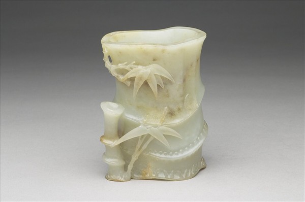 玉質,色灰白泛青,局部雜赭斑。全器作筒形,以竹節為造型,分三段,一側有短竹節、竹葉,與口沿處往下伸展的竹葉,兩相呼應。上方竹葉旁有刻御製詩。全文為「御製詩/颯颯葉全放/亭亭根互蟠/眼空上下古/意足兩三竿」。