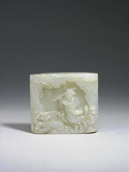 玉質,色白淨光潤泛青。片狀,一面雕琢「達摩渡江」,達摩側身立姿,右持拐,左拿冊,立於上為重岩,下波濤洶湧的江旁。另一面雕迴文詩廿字,由三點鐘順時鐘方向為「始終常妙極真離性情緣理空忘照寂身至淨明圓」。附鏤空波濤紋木座。