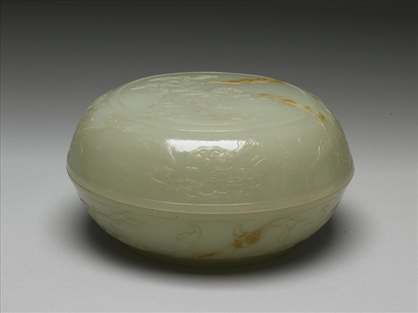 玉質,器表有數處裂紋,已沁作黃褐色。圓盒,帶蓋,圈足。蓋面中心浮雕牡丹、蝙蝠,象徵富貴、幸福之吉祥意義;蓋周圍與腹外壁浮雕竹、桃實、靈芝、水仙等紋。清時於宮中配有鏤雕木座。