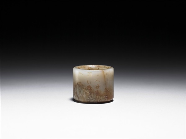 玉質,有大片赭沁,為舊玉新琢。全器為圓筒形,上面有刻銘,難以辨識。與一帶鉤、方琮一併置於仿經卷盒中,盒外並貼有籤紙,其上有隸書:「唐人寫經卷」。仿經卷盒和其他仿冊頁盒等大小收納盒共八組,共同置於一題有「歷代珍藏」之大木匣中。