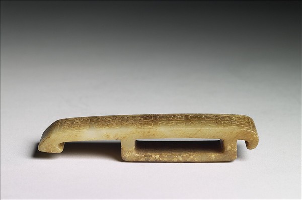 玉質,有大片赭沁。全器呈片狀,下方有方孔狀的銎,可固定於劍上。面飾雲紋。與二圓𤨕一併置於仿經卷盒中,盒外並貼有籤紙,其上有隸書:「五百羅漢卷」。仿經卷盒和其他仿冊頁盒等大小收納盒共八組,共同置於一題有「歷代珍藏」之大木匣中。
