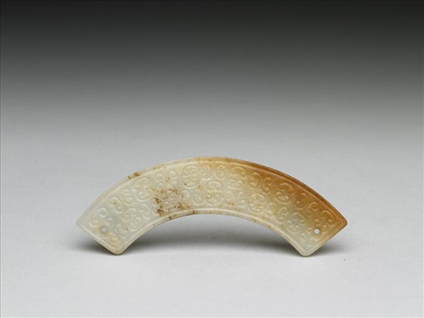 玉質,有赭斑。作璜形,兩端各有一穿,為單面鑿穿。器兩面皆飾雲紋。與玉瑗、玉系璧一併置於仿冊頁盒中,盒外刻款填金隸書:「石渠寶笈」。盒內並有書冊題籤:「宋版錦繡萬花谷下函」。仿經卷盒和其他仿冊頁盒等大小收納盒共八組,共同置於一題有「歷代珍藏」之大木匣中。