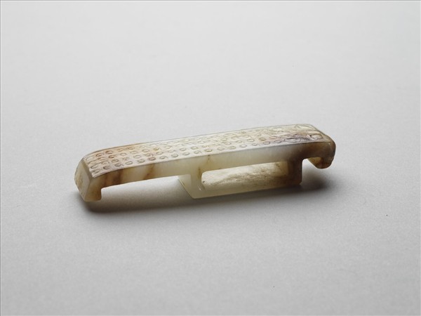白玉質,正面器表琢穀紋,側端飾一獸首。璏是嵌飾於劍鞘上的玉件,同時具有固定革帶的功能。本器是仿西漢的作品。