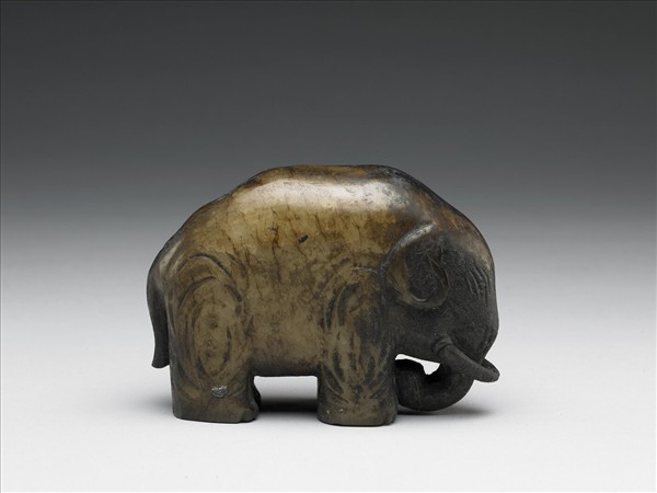 玉質,表面赭黑色。雕作象形,象直立,雙耳貼頰,長牙相交於鼻上,背上以幾道斜刀作脊椎。