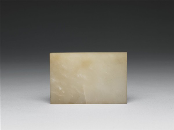 玉質。片狀,作長方形。光素無紋。背面有四對象鼻穿,與另外十九件玉片組成玉帶板。