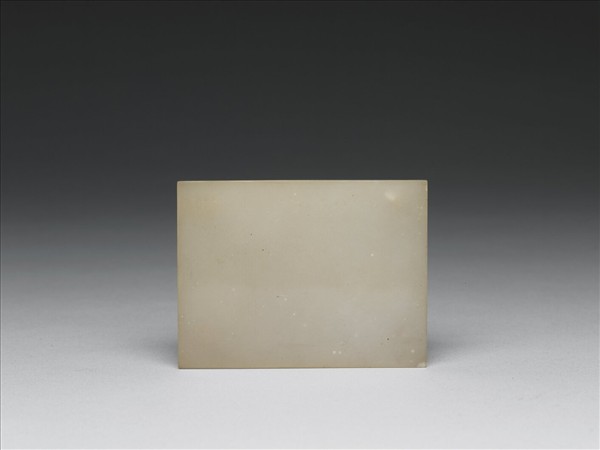 玉質。片狀,作長方形。光素無紋。背面有四對象鼻穿,與另外十九件玉片組成玉帶板。