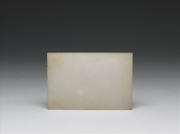 玉質。片狀,作長方形。光素無紋。背面有四對象鼻穿,與另外十九件玉片組成玉帶板。