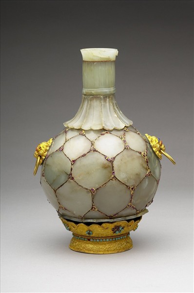 內部可能有金屬內膽,器腹上貼以六角形青白玉片,每片之間又鑲嵌了紅寶石及金箔包裹膠條的所謂「金絲」,形成華麗的表象。器底雕成一托座,最下面是內凹的圓片。器頸長,器口處嵌有一鑽鑿五個大圓孔的玉片。這是印度人吸水煙的大罐。但可能傳到清宮後,加配了兩個鎏金的銜環獸面。