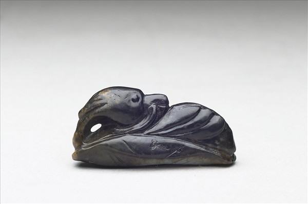 玉質,表面呈深紫色。雕作鵝形,臥在荷葉上,鵝首回顧,頸形成一個小圈,口啣荷莖。與另外四件玉飾件同儲於盒內。