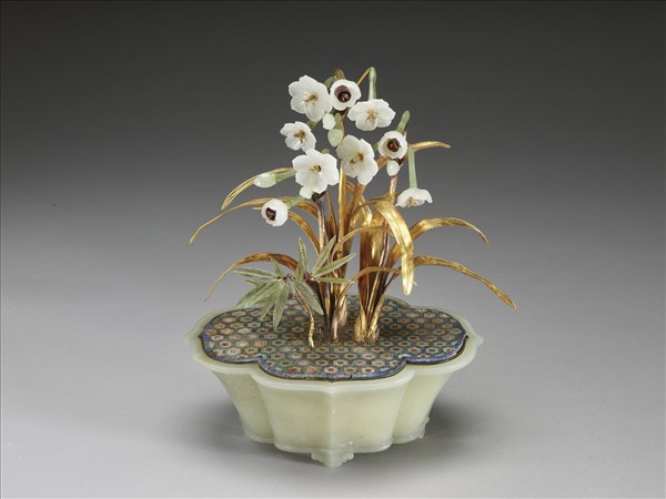 玉盆,盆作四瓣海棠花形,有四小足;盆上插嵌玉水仙花形及鍍金水仙葉。