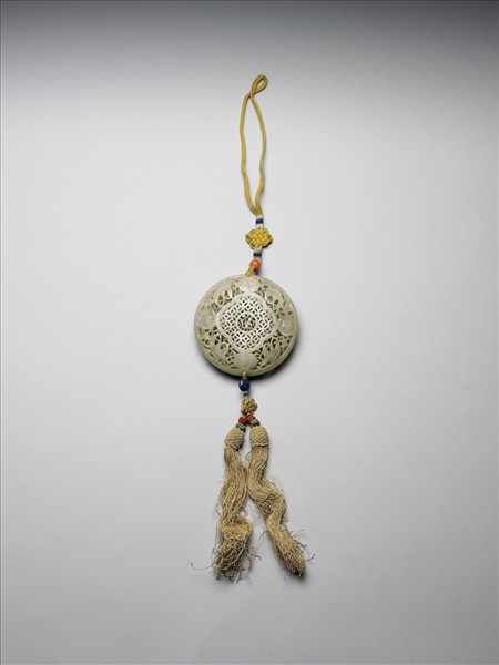 玉質。扁圓形盒,可分兩面打開,內置錦囊,用來包香品。器周圍刻回紋一週,兩面以多層鏤空及陰線刻技法雕紋飾,外緣琢蝙蝠、蝴蝶、石榴及花葉紋,寓意「多子、多福、多壽」,中央琢連續之銅錢紋。上、下端繫有黃絲穗及珊瑚、青金石珠各一粒。