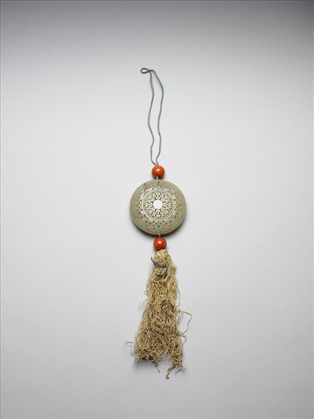 玉質。扁圓形盒,可分兩面打開,內置錦囊,用來包香品。器兩面鏤雕紋飾,外圍雕花葉紋,中央鏤雕編織圖案紋。上、下端繫有黃絲穗及珊瑚珠各一粒。