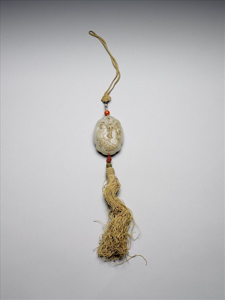 玉質。扁橢圓形盒,可分兩面打開,內置錦囊,用來包香品。一面鏤雕孩童拖車及葉紋,襯以萬字錦紋,另一面鏤雕孩童手持鋤頭挑籃及蕉葉紋,以寶相花錦紋為地。上端繫有珊瑚珠一粒。