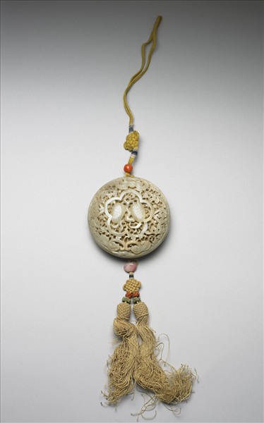 玉質。扁圓形盒,可分兩面打開,內置錦囊,用來包香品。兩面多層鏤雕蝙蝠、萬字符號、果實、靈芝、蝴蝶、花葉紋等,象徵「萬福臨門」之意。附黃色絲穗、珊瑚、粉紅色寶石珠各一。