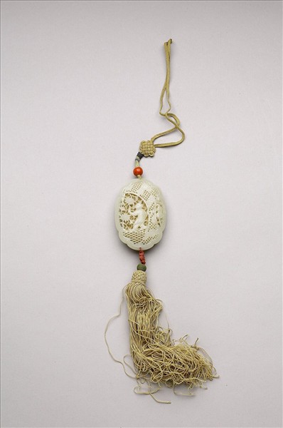 玉質。扁橢圓形盒,可分兩面打開,內置錦囊,用來包香品。兩面皆鏤雕紋飾,一面琢童子、菊花、葫蘆,葫蘆上有「大吉」二字;另面琢竹葉、秋葵、童子、葫蘆,葫蘆上亦有「大吉」二字。上下有絲穗,上端並繫有珊瑚珠一粒。