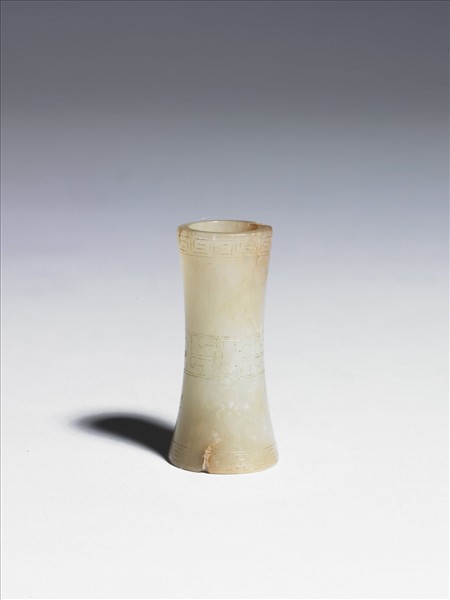 玉質,色白而有赭斑,口緣略有璺。圓柱形,二端口緣外撇,中收細圓腰,上下有對穿大孔以佩掛。上下緣處各陰線刻回紋一圈,中腰處淺琢幾何化竊曲紋一圈。本件現與另四件玉器同收一於日本蒔繪長方菊花漆匣。可能原為商至西周時玉管,用作杖頂或隨葬時的手握之物,器表花紋可能為明清時加刻。