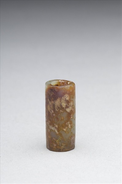 玉質,器表染成斑剝的土黃至褐色。圓管狀,略帶歪斜。可能為新石器時代晚期至西周時期玉管,在明清時期染色。