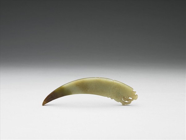 玉質,一端為褐色。雕一仿古的龍紋觿。「觿」為獸牙或獸角做成的解結工具,遠古時期的先民配戴作日常生活所用的小工具。東周至漢代貴族流行用玉雕琢,並裝飾以龍鳳紋。這件仿古玉觿體積較大,龍頭的腮旁雕琢了穀紋與一隻鳳鳥,龍身部位以細陰線雕雲紋。