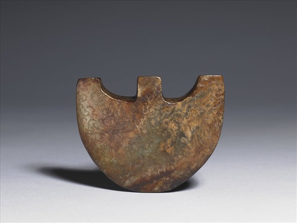 三叉形器是良渚文化早中期,太湖南邊、東邊地區的男性貴族專用的頭飾。它的造形也可能源自飛鳥。從考古資料可知,常在中央上方連結一長玉管。院藏這件背面共有四個均有直穿的方突,下端的豎穿應該用來固定,上面的三個豎穿很可能曾插飾羽毛之類的軟性裝飾。這件三叉形器曾於明晚期至清初被加刻仿古的雲彩、鳳鳥紋、回紋及穀紋,還加染了褐色,染劑殘留在紋飾縫中。