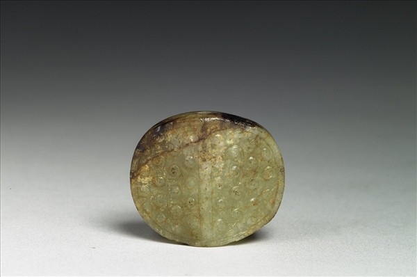 玉質,色青灰帶黃,有赭斑與土沁。略呈橢圓形,由兩道繩索紋垂直分割成均等的四塊小面積,其內裝飾戰國晚期至西漢早期常見的花卉紋,反面則裝飾戰國中期至西漢中期常見的穀紋。