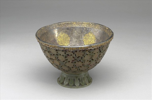 大型玉碗,碗壁鏤雕花葉紋,玉花部位染成褐黃色,玉葉部位染成綠色。高圈足鏤雕葉紋,染成綠色。碗的內壁又鑲銀膽,碗心與內壁上,貼嵌鍍金片。
