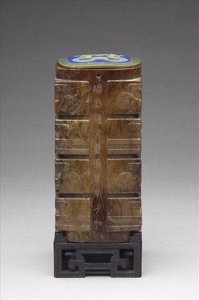 全器作略呈上大下小的四方柱體,中孔甚大,下端的四邊上,還各有一小圓孔。配製了精美的紫檀木座,以及一端飾有琺瑯,留有插花孔的銅膽,銅膽可裝入玉器的中孔,來盛水插花。乾隆皇帝題詩。