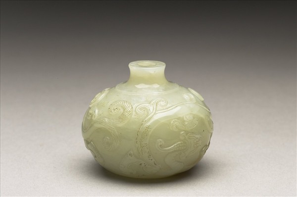 玉質,青白冷灰綠色,底有璺,拋光晶亮。器作球形,上有小口細頸。器身淺浮雕首尾相接螭龍二隻,間飾雲紋。缺蓋。器底琢「乾隆年製」四字篆款。