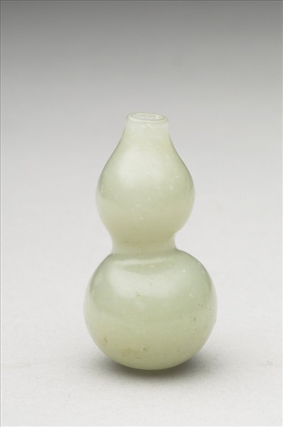 玉質,色白泛青,有白暈斑點。器作葫蘆形,下大上小略有歪斜,有小唇口,全器光素無紋。缺蓋。器底琢「乾隆年製」隸款。