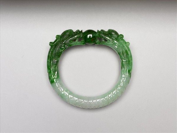 深淺不一的翠綠色。手鐲,深色部分雕飾雙龍搶珠紋,雙龍龍身相連,形成環形。
