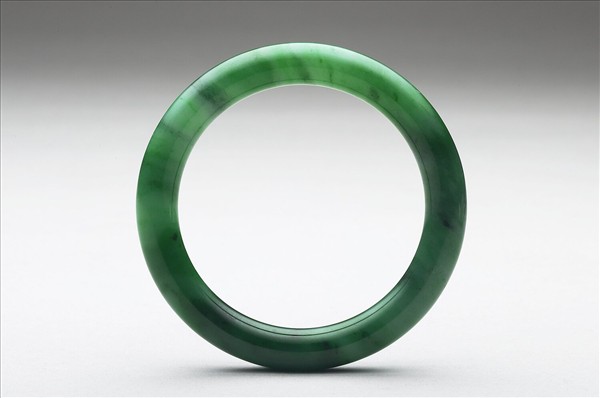 翠玉質,雜有深綠斑。器作圓環形,光素無紋。