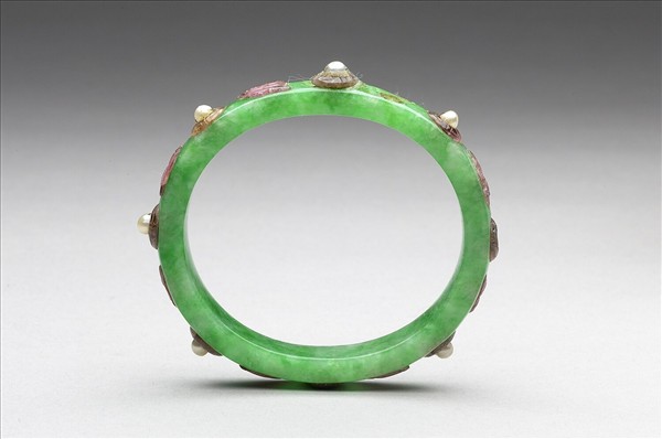 翠玉,大部分呈綠色。器作環形,略近橢圓。器之內徑與外徑面均削平,外徑面上鑲嵌紫玉及珍珠為飾。