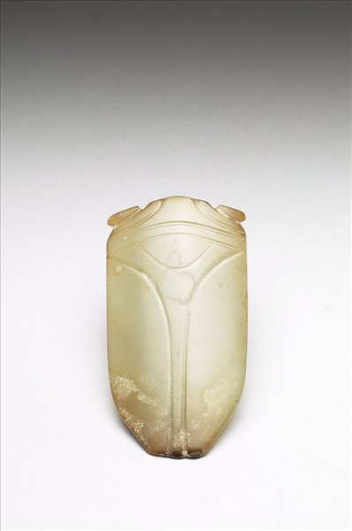玉質,器尾端有赭斑及土沁痕。全器作蟬形,中央厚、兩側薄,中央上方鑽有隧孔。用簡單線條表現羽翅、身、頭等部位。
