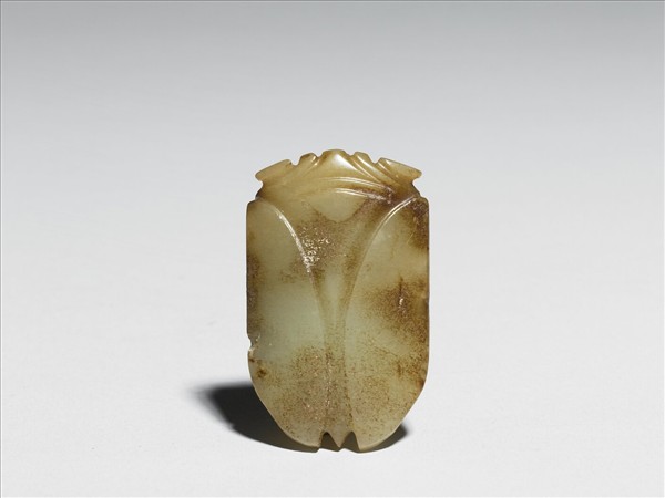 玉質,有赭斑。全器作蟬形,中央上方鑽有隧孔,中央厚、兩側薄。用簡單線條表現羽翅、身、頭等部位。