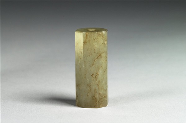 玉質,玉色泛黃,有赭斑及白斑。全器呈八邊柱狀體,上下有通心圓穿,無紋飾。