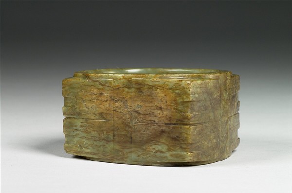 良渚文化早期,華東地區主要流行「動物精靈崇拜」的信仰,巫師穿戴各式雕琢動物紋飾的玉器,期盼神靈動物的法力助人通神。玉鐲外圍浮雕四個或四組「面紋」,令圓鐲逐漸趨向方鐲。但此時還用以套戴於巫覡手腕上,尚不具有祭祀地祇的功能,所以不該稱之為「琮」。 此器在清宮中曾加配銅膽、木座,用作花插。外壁可能曾經盤摩與染色,內壁仍保持原有的青綠色。方柱體,仍保留淺圓弧器壁。紋飾分上下二節,各琢雙圈加三角形眼角的小眼面紋,長橫稜上琢多條平行線。短橫稜上琢回紋。