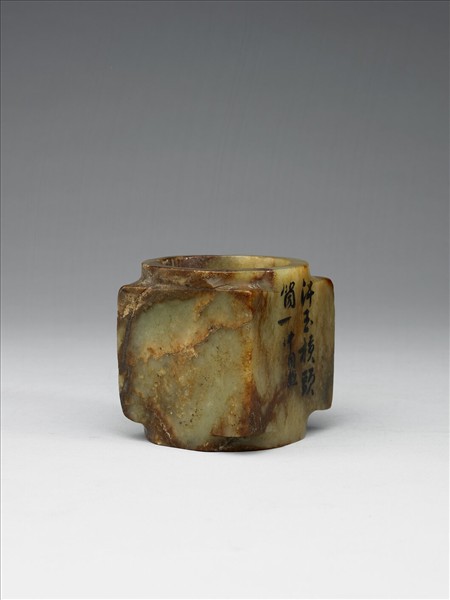 灰青帶暗褐色玉質。器面小裂痕密布,裂縫兩側皆呈暗褐色。內圓外方琮形,射頸甚短,四方體寬窄不一,射口內、外圈圓整,孔壁拋磨光滑。附銅膽,器外一面墨書「汗玉槓頭筒一件同膽」,概為清代或民初經手者所書。
