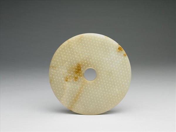 白玉璧,局部微有黃斑。全器呈圓璧形,外緣規整。孔徑略小。兩面均浮雕穀紋。