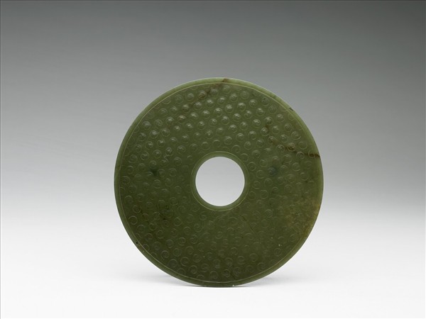 碧玉,半透明。圓整,平廓,廓線較深且圓整;中孔、外緣齊整;器面刻飾穀紋。
