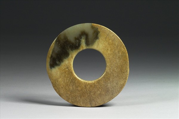 玉質,大部分鈣化成褐黃色,小部分尚留半透明的灰脂色玉質,有暗褐色斑。圓整,外緣邊肉上局部磨薄,一端按下削薄;中孔單面桯鑽,孔壁微斜,隱約可見旋轉紋。表面光素。