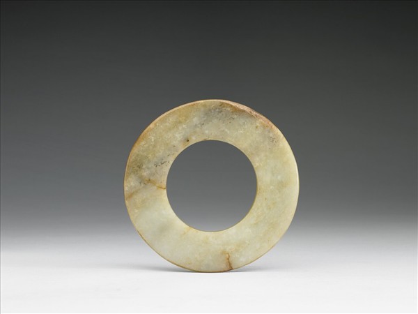 玉質,帶黑、褐色斑。圓璧,外緣規整。孔徑略大。璧面光滑無紋飾。