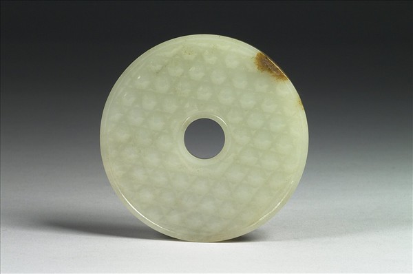 青玉璧,璧緣有一點赭斑。全器呈圓璧形,外緣規整。孔徑略小。器一面有以三種不同方向之平行線紋交叉而成的乳丁形。一面浮雕幾何卷草紋。