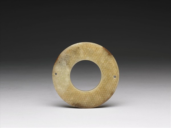 不甚勻淨的淺青綠玉,琢作甚薄的小璧,邊緣數處沁為深褐色。比例上中孔較大。兩面各有一塊斜切面,孔緣與璧緣均留出約0.12-0.3公分的窄緣。二窄緣間的器表以三組方向不同的平行線交叉構成格子般的蒲紋,因為兩面均各有一片不小的斜切面,令刻陰線紋的工作也分別處理,造成明顯的差異,在部分靠邊緣處就製作得更為草率。左右兩邊對稱地各鑽鑿一小孔。從上海西林塔、浙江蘭溪,以及江西南豐琴城鎮出土的南宋玉璧可知,當時也在玉璧上只雕琢穀紋、蒲紋、乳丁紋等幾何紋飾。