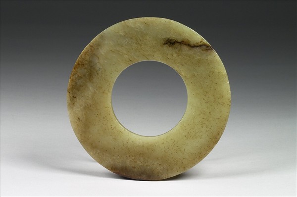 玉質,局部泛黃灰色,雜有淺褐斑及長條裂紋。全器呈圓璧形,琢治規整,光素無紋。