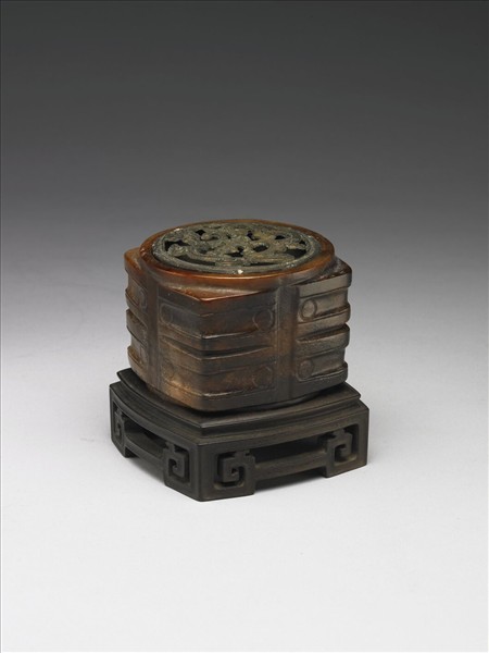 玉質,深淺交雜的赭色。琮,中間有孔貫穿全器,內圓外方,上下有短射口,加上銅膽、木座,為陳設之器。外壁琢飾兩節小眼面紋。目前尚無相似的考古出土玉器。