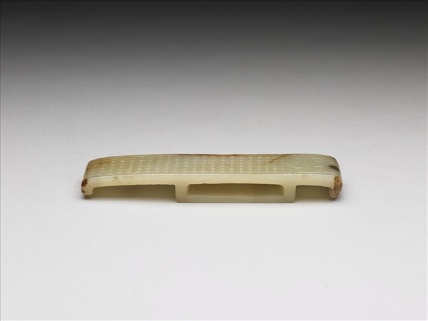 玉質,上端飾以獨立獸面,特徵和戰國至西漢常見的銅鋪首以及玉鋪首(故玉2176)如出一轍。