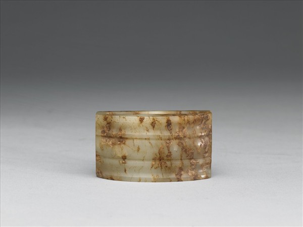 玉質,玉色泛黃,夾雜點狀褐斑。玉璏為戰國至漢代劍鞘上的嵌飾,因有長槽可將腰帶穿繫過去,固可將劍鞘固定在腰帶上。此件玉璏呈長方形,正面略作弧形,琢弦紋四道,下端有一方形穿帶孔。
